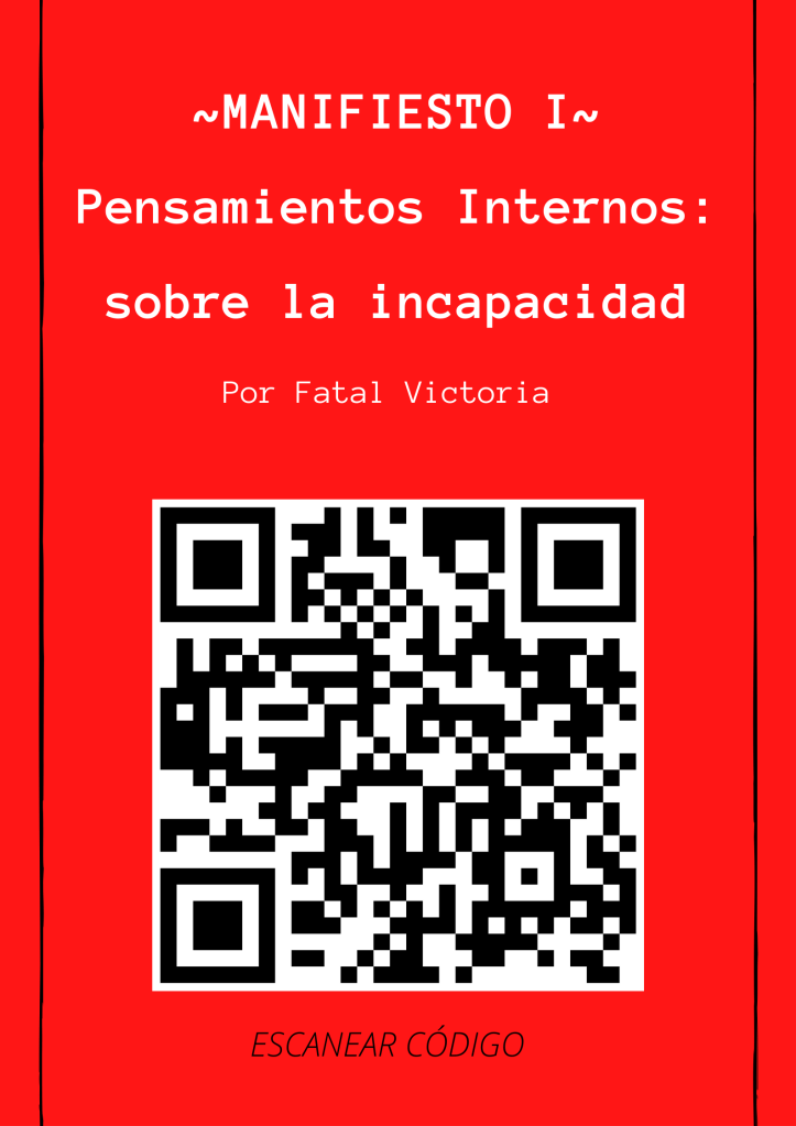 Categorías Fatal Victoria Manifiesto I. Pensamientos internos: sobre la incapacidad Post author De Ésto-no-es-crítica Post date 3 de diciembre, 2021 No hay comentarios en Manifiesto I. Pensamientos internos: sobre la incapacidad Fatal Victoria. Manifiesto I. Pensamientos internos: sobre la incapacidad.2021. Comparte esto: Haz clic para compartir en X (Se abre en una ventana nueva) X Haz clic para compartir en Facebook (Se abre en una ventana nueva) Facebook Me gusta Cargando... Relacionado De Ésto-no-es-crítica correo: estonoescritica@gmail.com View Archive → ← Del mundo → 日本語レッスン (nihongoressun) Deja un comentario Cancelar la respuesta Δ