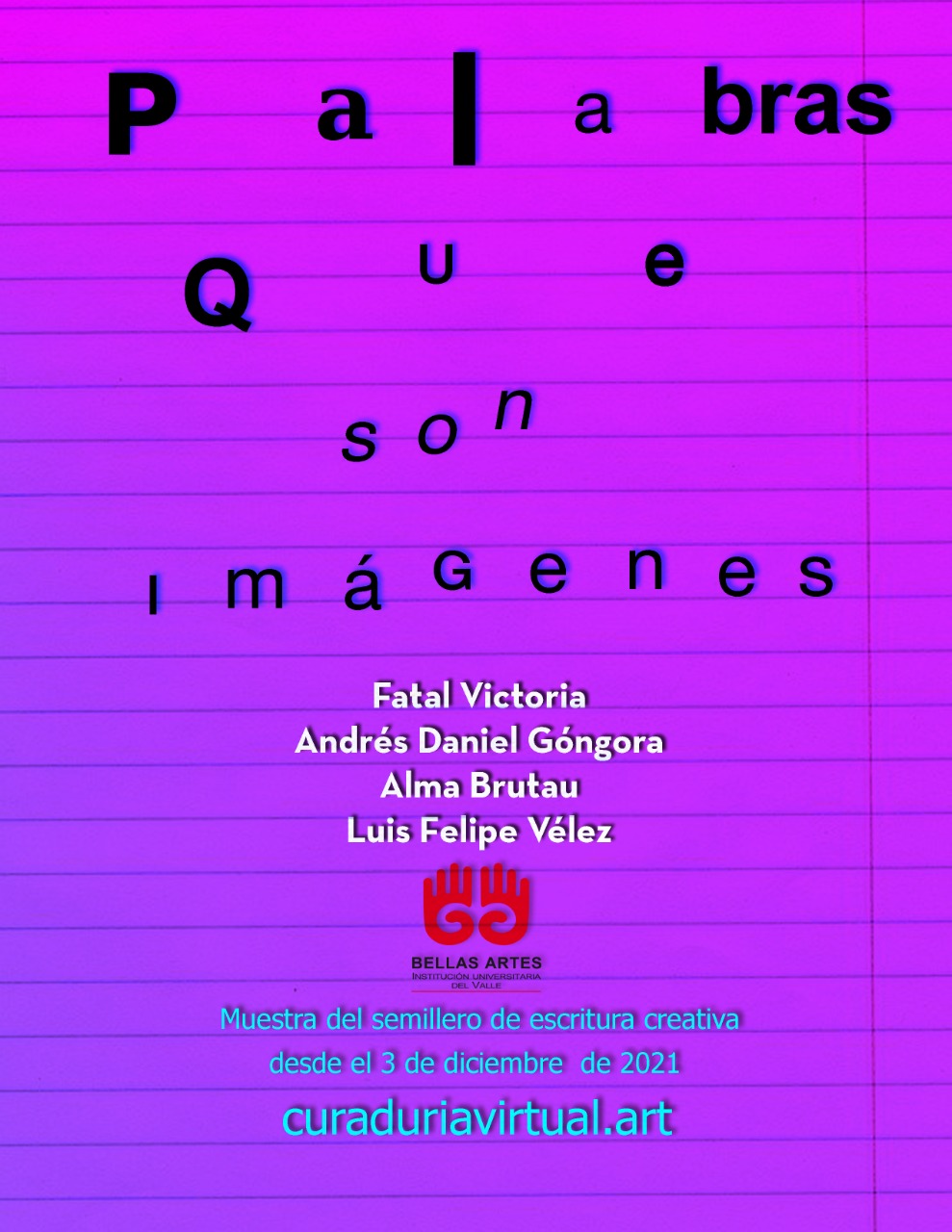 Los siguientes son los resultados del semillero de Escritura creativa en el semestre 2021 – 2 de Bellas Artes, Cali, cuyo tema fue «Palabras que son imágenes». En la parte de abajo encontrarán los nombres de les participantes, ingresando en elles pueden acceder a sus obras.